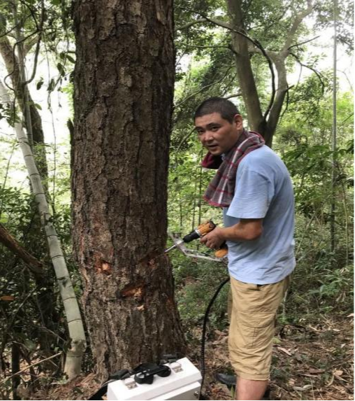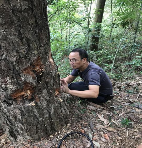2022年9月8號,汪洋帶上綠友電動樹干打孔注藥機、木塞、藥品以及相應(yīng)工具。早上五點鐘從廣州出發(fā),舟車勞頓數(shù)百公里,踏上拯救坪坑參天古樹的旅程。趕到潮州坪坑村,村委部文主任領(lǐng)路去村后的山上查看古松樹。在看過所有的古樹以后,根據(jù)松樹的枯葉癥狀,樹木呈現(xiàn)出來的病癥,最后診斷確認是松材線蟲危害所致。汪洋將診斷結(jié)果以及解決方案告知文主任,并通過電話向省林業(yè)部領(lǐng)導(dǎo)作匯報,得到批復(fù)后立即展開作業(yè)。