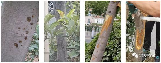 筆者上周在河南等地走訪各大公園、主干道路時發(fā)現,櫻花、海棠等中等喬木的樹木葉片開始發(fā)黃枯萎,葉片掉落,很多養(yǎng)護人員誤認為是葉片病害,葉噴百菌清等殺菌農藥,卻不見起色;待到后期主干、主枝出現潰瘍、腐爛、干腐,甚至爆皮,最終導致枝干脫水死亡。