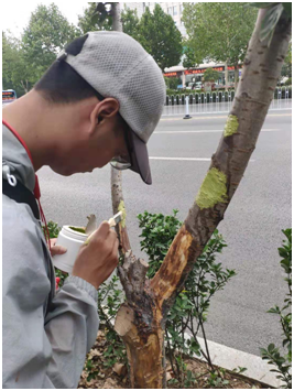 涂抹殺菌劑兩周后,針對枝干,仍要使用扮綠100倍+綠比多500倍噴淋。