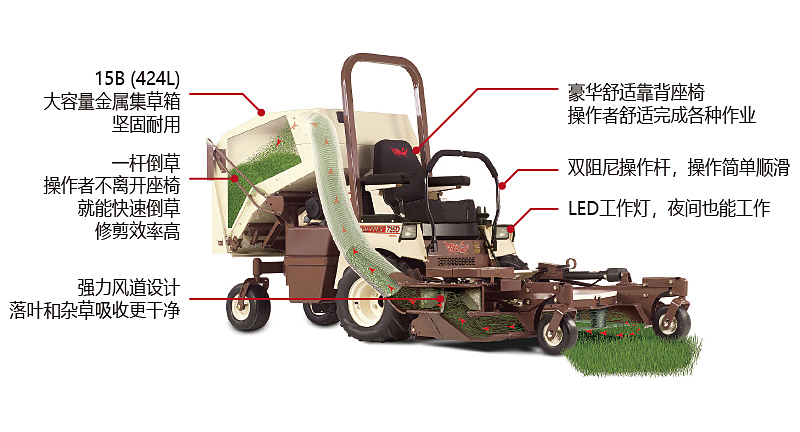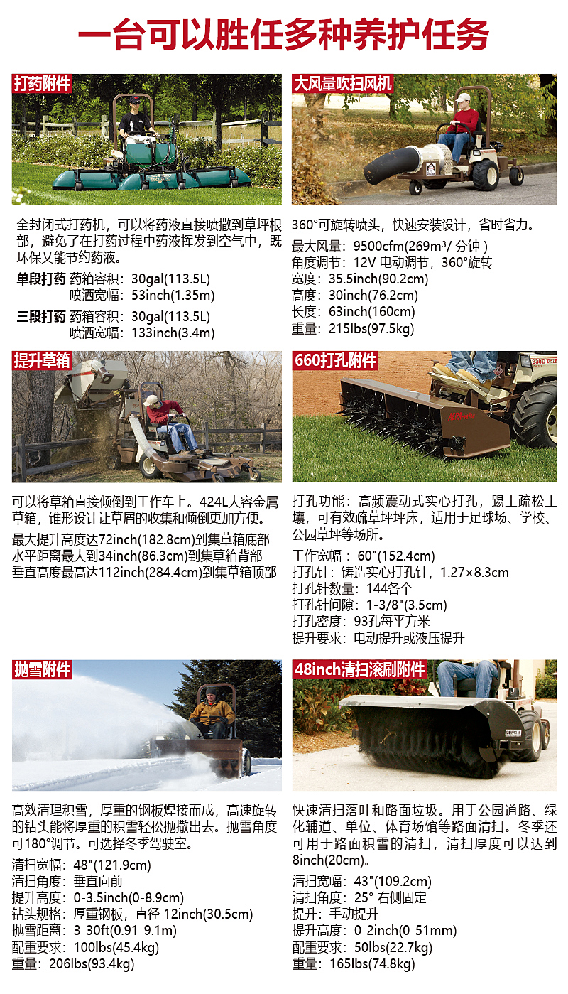 多種功能附件可供選擇:收草、梳草、切邊、密閉打藥、打孔、風(fēng)機(jī)、遮陽(yáng)篷等。