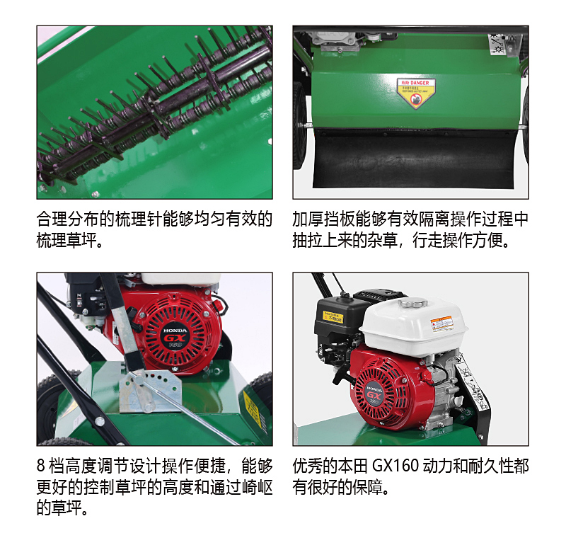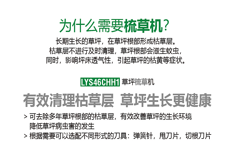 草坪生長一段時(shí)間后,底部會(huì)結(jié)出一層枯草層,時(shí)間一長,不參加光合作用,會(huì)霉變腐爛,滋生霉菌,阻礙土壤吸收氧份,導(dǎo)致草坪枯萎,使草坪生長不良,草坪很難看,這時(shí)噴灑藥物,不能治本,應(yīng)將枯草清除。梳草機(jī)就很省事的能把枯草去除。